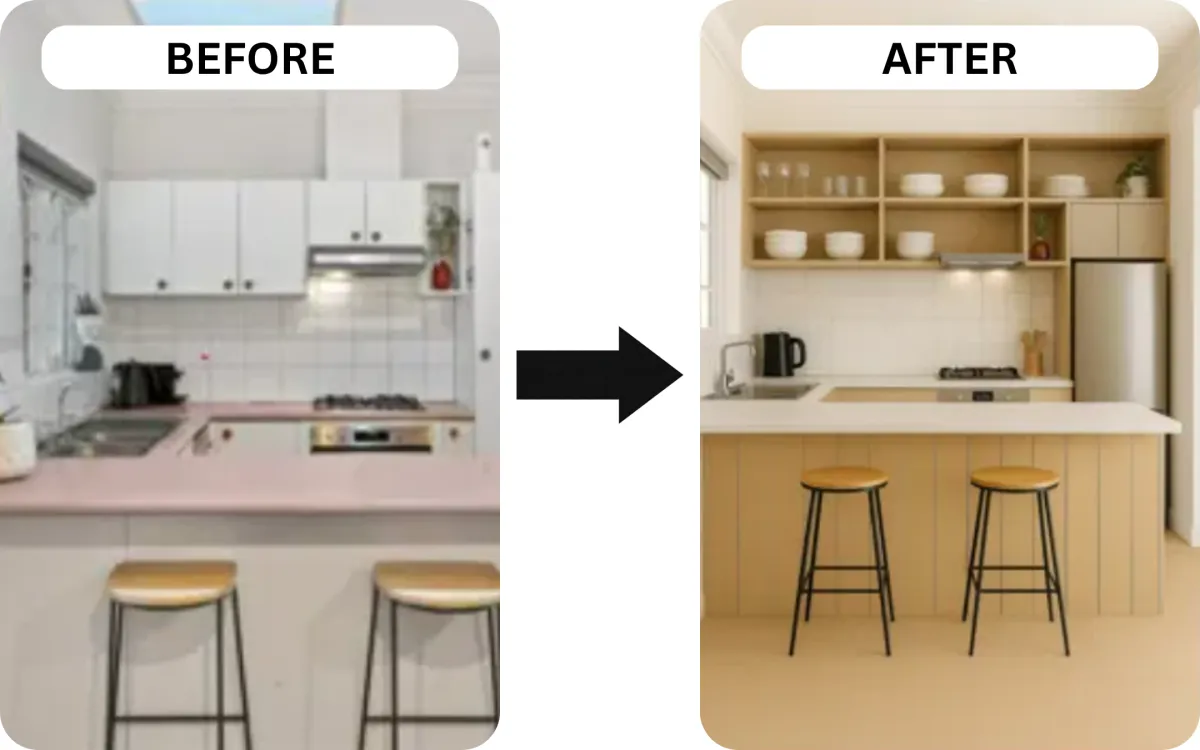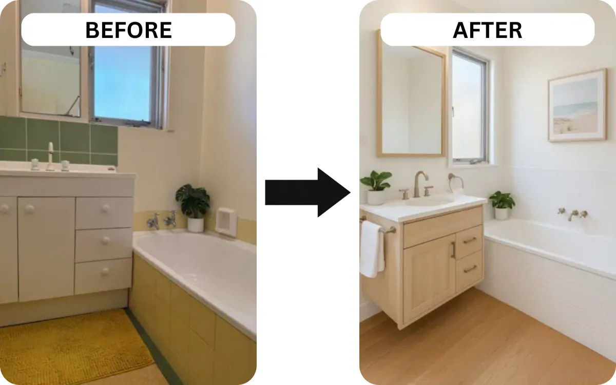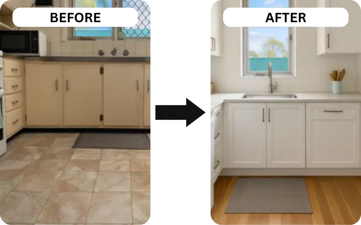 Great question! Resurfacing means we work with what you already have. Instead of ripping out your cabinets, benchtops or tiles and replacing them entirely, we professionally prep, repair and refinish the existing surfaces to look completely brand new. Same bones, totally fresh look — without the sledgehammers, the skip bins or the weeks of chaos. It's smarter, faster and so much more affordable.